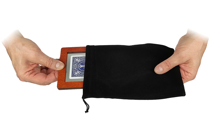 The magician shows the spectators an empty black velvet bag and a framed prediction card (10 of Spades for example), which is sealed between two plexiglass sheets.